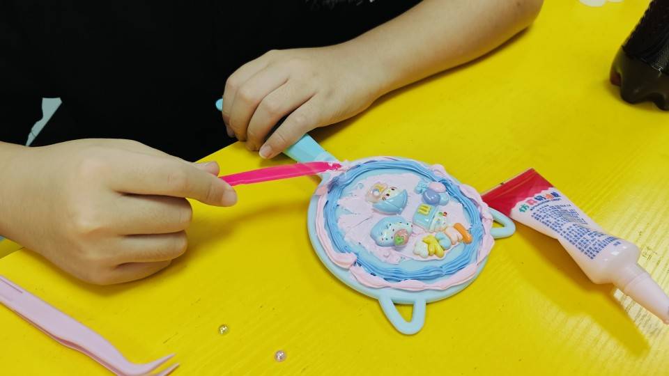 本次活動中,孩子們以一面面小巧圓潤的鏡子為畫布,用五彩繽紛的奶油膠勾勒夢想輪廓,搭配小珠子、亮片、塑料小花等裝飾配件,在小鏟子與鑷子的巧妙配合下,將平凡化為驚艷。