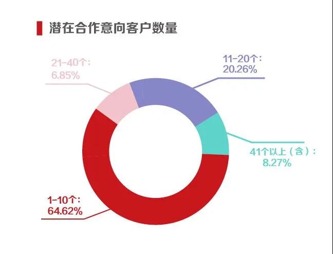 從調(diào)查可知,在展會(huì)期間獲得10個(gè)以?xún)?nèi)潛在精準(zhǔn)合作的展商比例達(dá)64.62%,35.38%獲得11個(gè)以上潛在合作意向企業(yè),其中41個(gè)以上的比例比往屆有所增長(zhǎng),為8.27%。