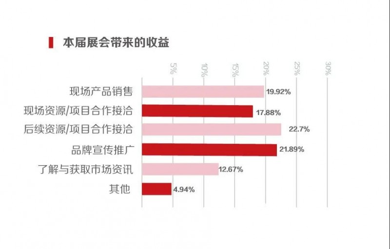 展會(huì)上給展商朋友們帶來(lái)了更多的現(xiàn)場(chǎng)資源對(duì)接,其中現(xiàn)場(chǎng)產(chǎn)品銷(xiāo)售為19.92%、現(xiàn)場(chǎng)資源項(xiàng)目接洽為17.88%;后續(xù)潛在的資源/項(xiàng)目合作接洽的效果較為明顯,占比達(dá)到22.7%;企業(yè)品牌宣傳推廣的比例也達(dá)到了21.89%。0.39%位居第二。