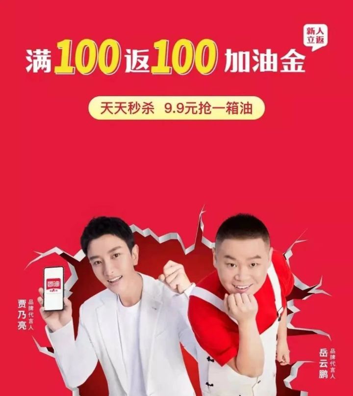 團油請來了明星賈乃亮和岳云鵬代言,宣稱''加油用團油,不當冤大頭'',解決司機''油貴焦慮''。