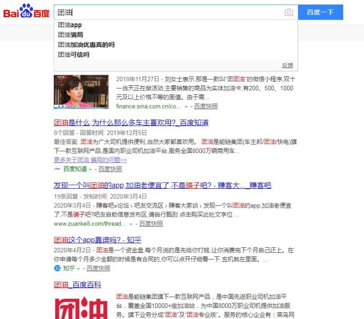 在網絡上搜索團油兩個字可以發現,冒出來的關聯詞都是''團油騙局'',''團油加油優惠騙局''等。