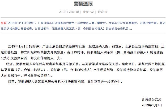 1月1日18時許,廣西北海合浦縣白沙鎮新屋村發生一起有意殺人案,導致一對父子經急救無效死亡。據悉,犯罪嫌疑人與兩名死者為親兄弟、親叔侄關系。案發后,合浦縣公安局高度注重,迅速出警處置,并當即組織相關警力開展偵察。