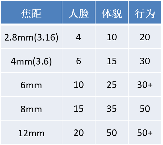 對于監控距離而言,不同的人監控的目標不一樣,對應的監控范圍就不一樣。監控人臉、監控人的體貌、監控人的行為這是三種完全不同的概念。我們以常見的200W機型為例,針對不同的監控目標,IPC焦距與監控距離的關系如下: