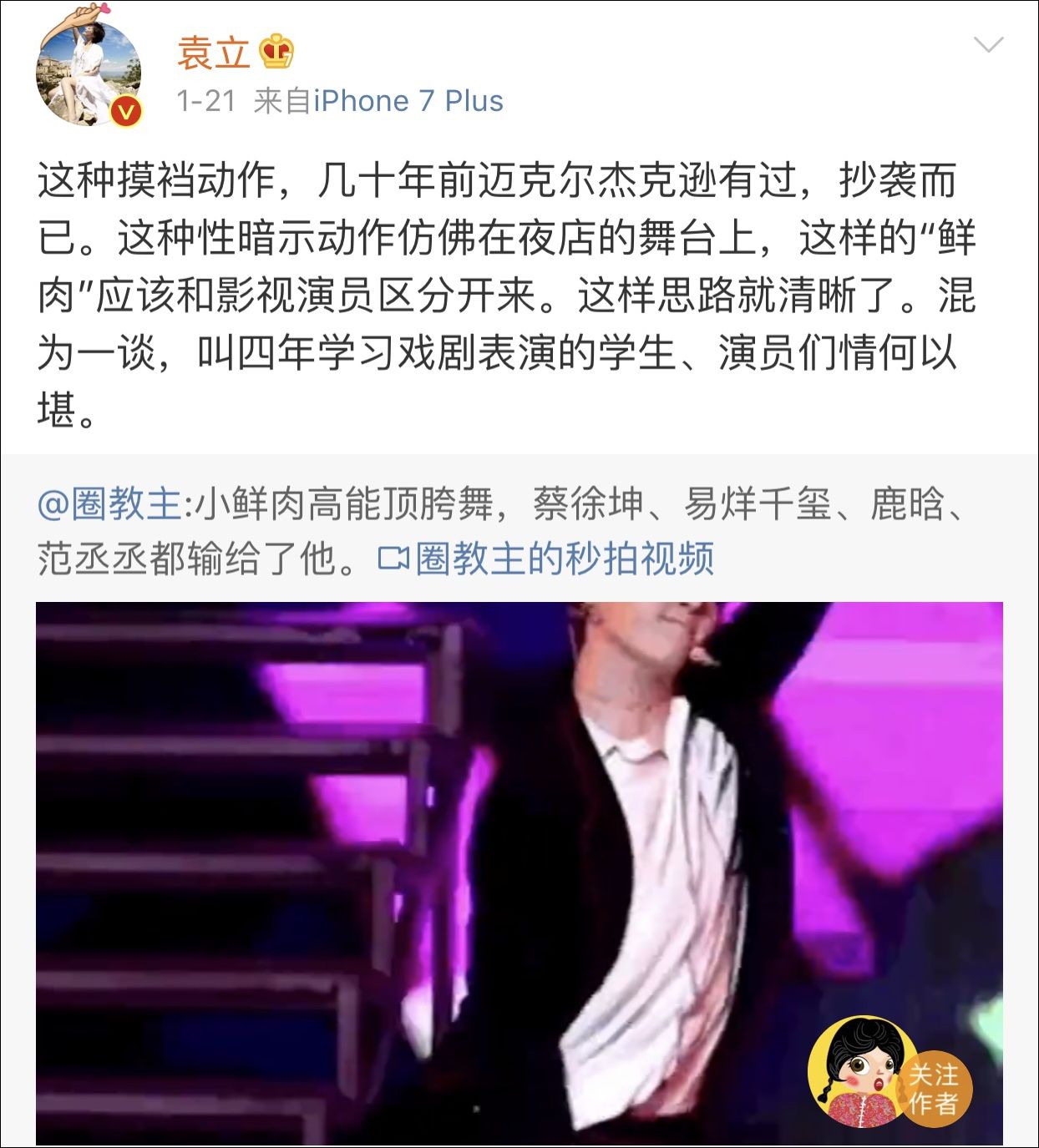 對(duì)標(biāo)杰克遜的回答,21日晚,當(dāng)袁立在微博上發(fā)出對(duì)頂胯行為的評(píng)價(jià)后,有網(wǎng)友認(rèn)為袁立的說(shuō)法太苛刻,頂胯只是舞蹈需要,只是每個(gè)人跳出來(lái)的風(fēng)格有差異而已。