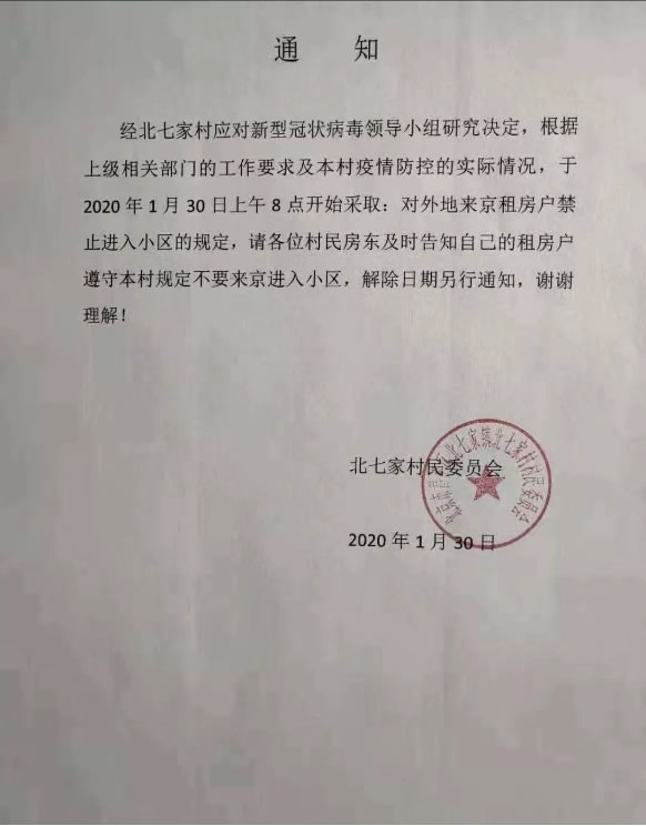 1月31日,北京市政府發(fā)文稱,“除必需行業(yè)外,各企業(yè)2月10日上班”,將迫在眉睫的返京大潮又往后推遲一個禮拜。只不過,這個文件仍然為企業(yè)要求員工返京彈性工作留有余地。已經回京的上班族,已有不少人已經在外流浪數(shù)日。陸續(xù)有北七家等地的房客被租住小區(qū)拒之門外,據(jù)不完全統(tǒng)計,這些小區(qū)當中的大多數(shù)都由村委會管理,這類強調“村民自治”的小區(qū),自認為在社區(qū)管理層面有較大的自由度。他們對房客提出了要求,“自行在外隔離14天”,“14天后出示三甲醫(yī)院出具的健康證明”