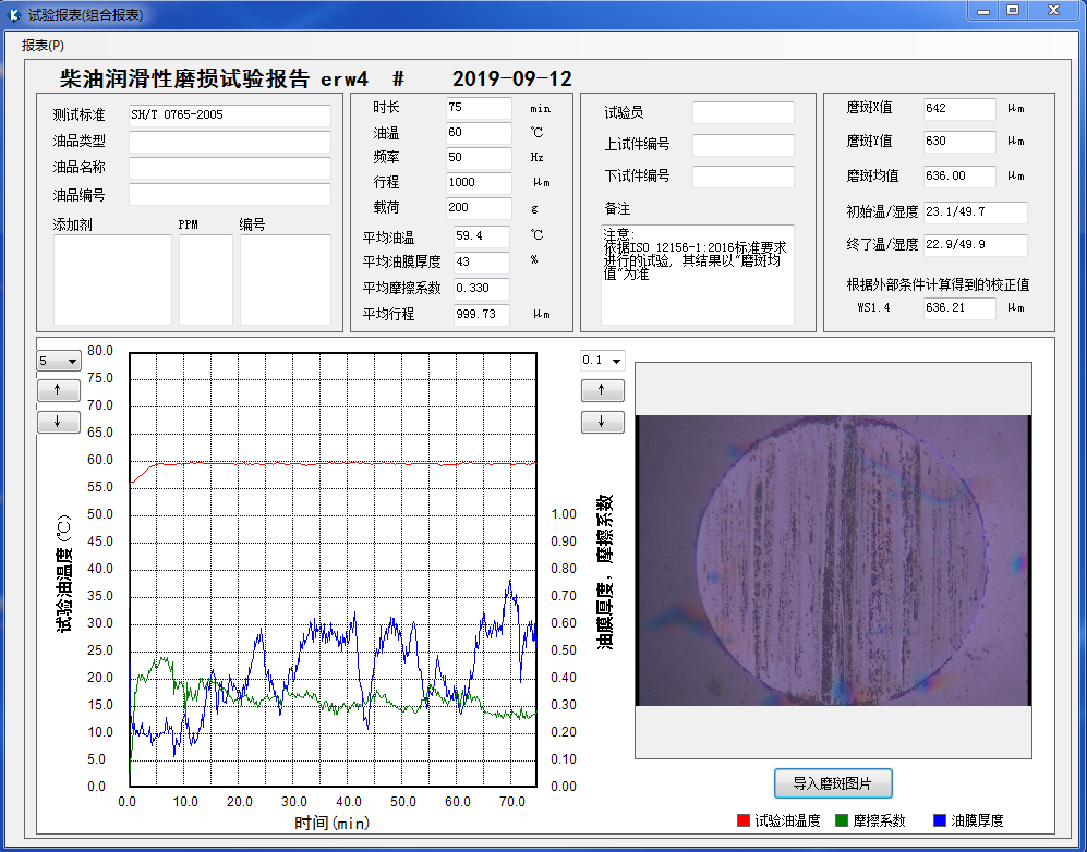 3、軟件系統:試驗操作界面中可隨時調取ISO 12156.1-2018標準中對環境允許范圍(溫度、相對濕度)標準圖形;該軟件控件同時可自動控制、數據采集、數據實時監控、數據計算、形成報告、參數標定及試驗后數據瀏覽等,同時可連接中石化、中石油集團實驗數據庫將實驗數據及資料實時上傳、共享。試驗結束后,系統自動停機,磨斑拍照測量后,可將磨斑圖片嵌入試驗報告中形成一份完整的試驗報告。圖例如下:
