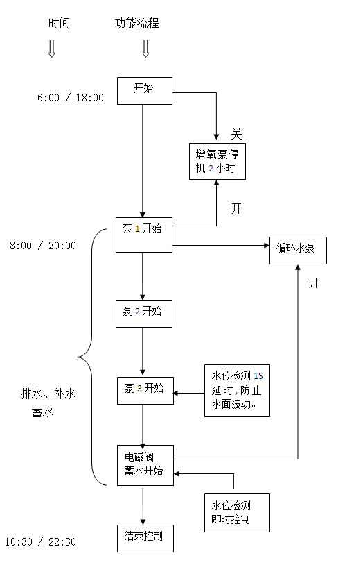 1、按設定時間關停增氧泵的運轉,讓水循環泵的水流帶動魚的排泄物向排污口聚集,達到所需時間后開啟增氧泵,運行周期直到下一個流程的設定功能作用時間。