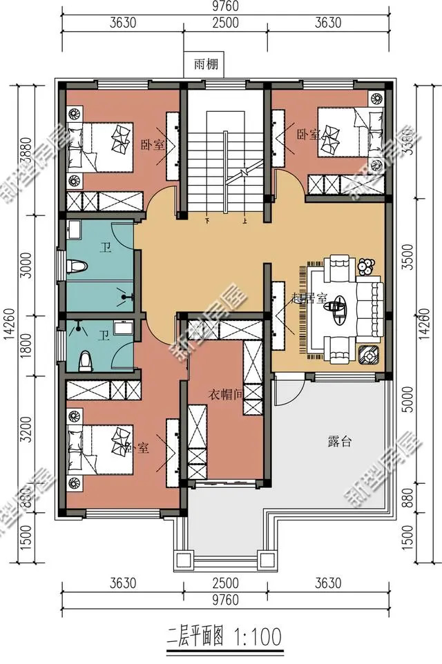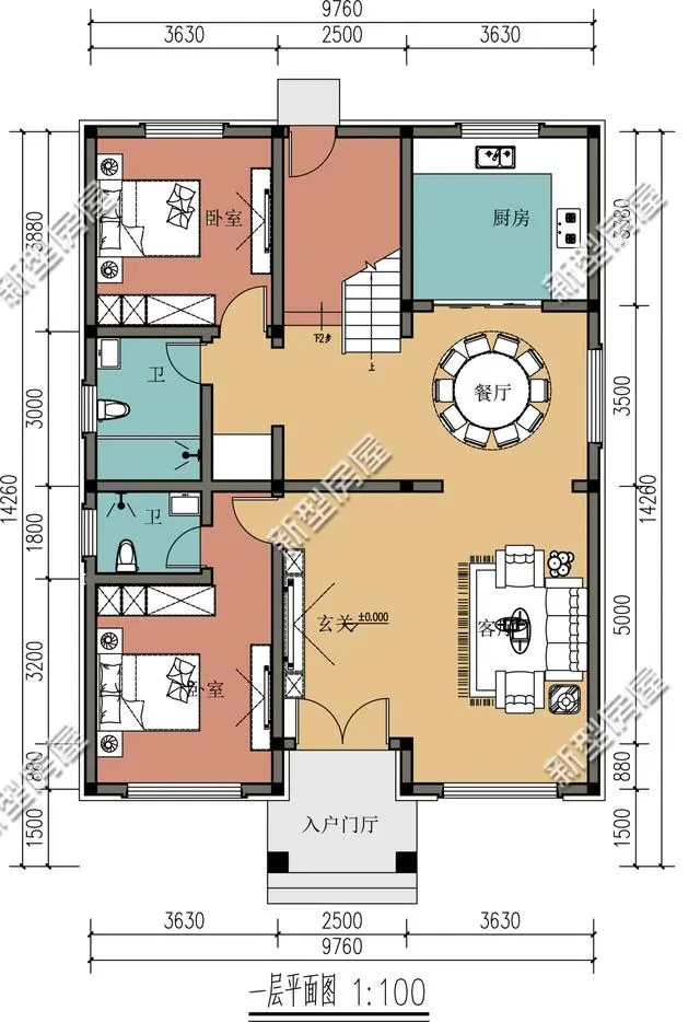 第4套:雙入戶門+觀景露臺+多臥室,9×14米新中式戶型,主體預算30萬