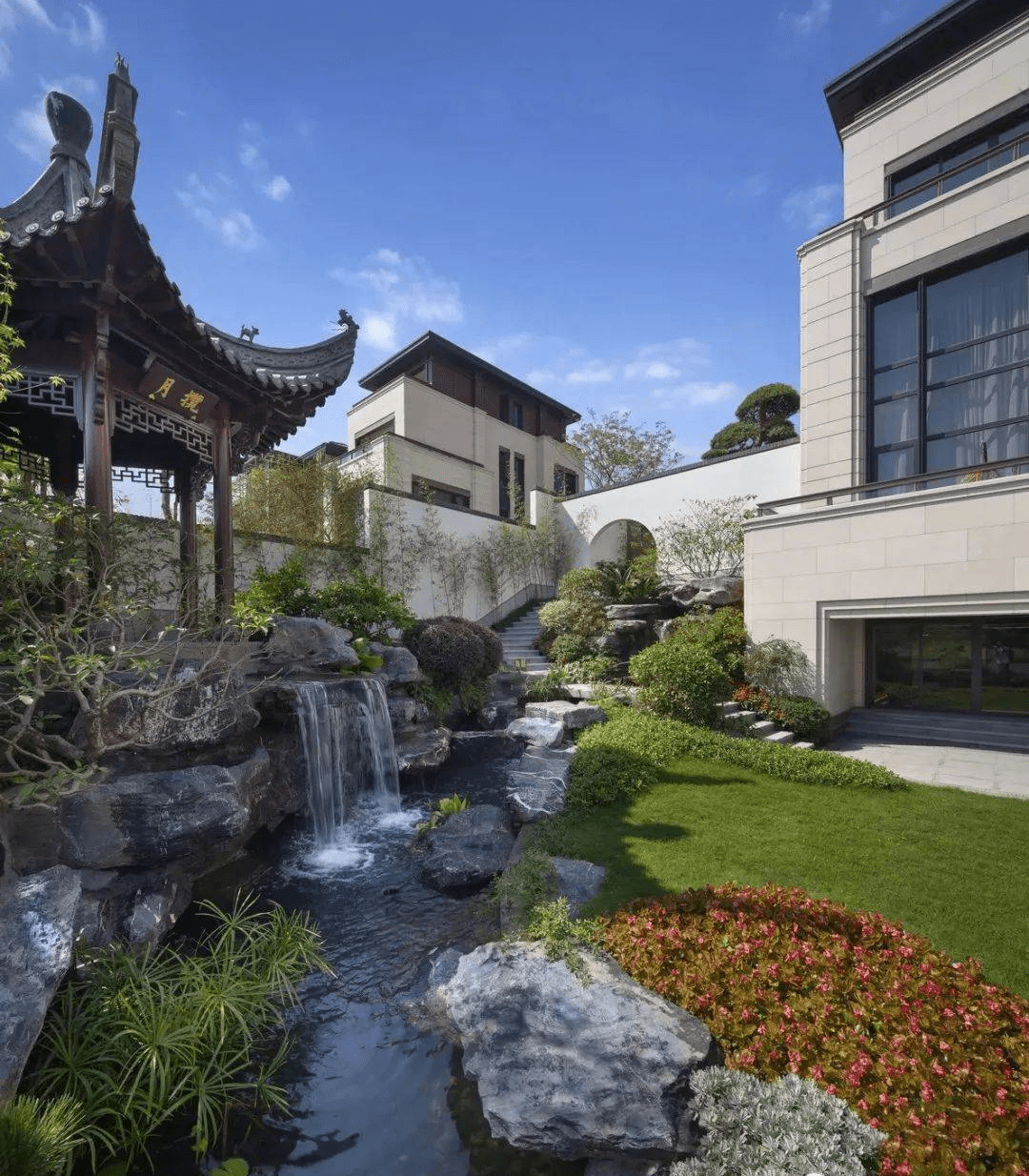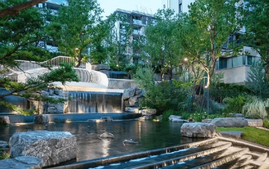 溪流是提取了山水園林中溪澗景色的精華,再現(xiàn)于城市園林之中,居住區(qū)里的溪澗是回歸自然的真實寫照。小徑曲折多次,溪水忽隱忽明,因落差而造成的流水聲音,丁冬做響,人達到了仿佛親臨自然的境界。