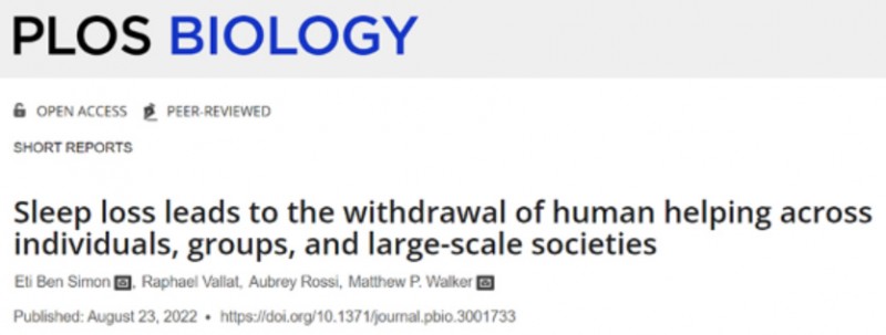 2022年8月23日,美國加州大學(xué)的研究人員在" PLOS Biology "期刊上發(fā)表了一篇題為" Sleep loss leads to the withdrawal of human helping across individuals,groups,and large-scale societies "的研究論文。