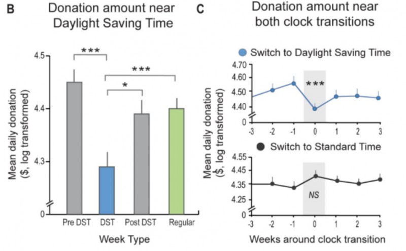 在第三項研究中,研究人員分析了2001-2016年間美國300萬筆慈善捐款的數(shù)據(jù)庫,在過渡到夏令時和可能失去一小時睡眠后,分析了捐款數(shù)量是否發(fā)生了變化。
