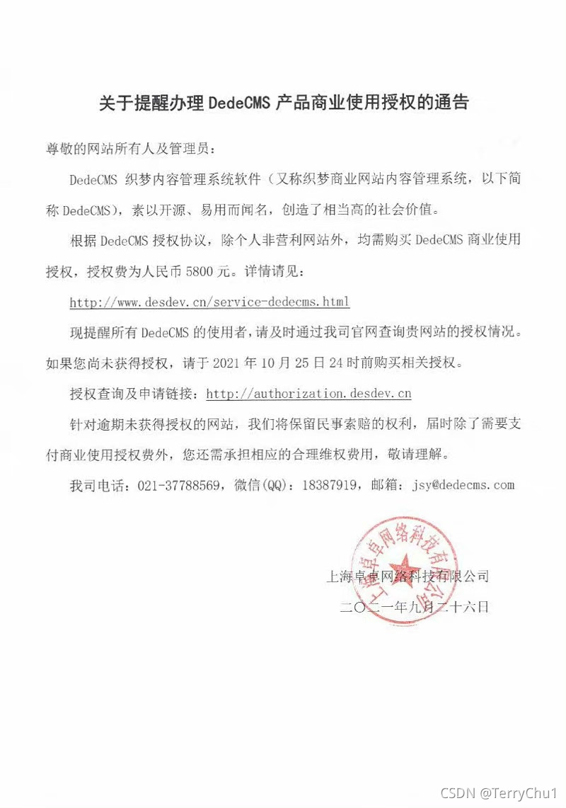 9月26日,dedecms(織夢(mèng))發(fā)布公告:除個(gè)人非盈利網(wǎng)站外,所有商用的個(gè)人、企業(yè),均需要購買DedeCMS商業(yè)使用授權(quán),授權(quán)費(fèi)為5800元。“針對(duì)逾期(2021年10月25日24時(shí))未獲得授權(quán)的網(wǎng)站,我們將保留民事索賠權(quán)利,屆時(shí)除了需需要支付商業(yè)使用授權(quán)費(fèi)外,您還需承擔(dān)相應(yīng)的合理維權(quán)費(fèi)用。”在經(jīng)歷了一年多的版權(quán)之爭(zhēng)后,織夢(mèng)終于也收費(fèi)了。