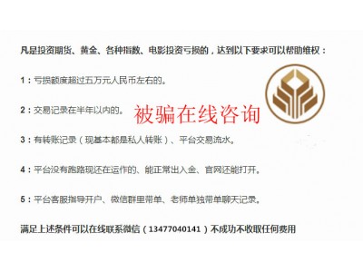 投資市場瞬息萬變,騙局套路層出不窮。切勿輕信高回報與所謂的專家策略,夯實自身交易技術,提高鑒別黑平臺、虛假公司的能力,才是保護自身財產安全最直接有效的方法!如果遇到類似情況,大家都可以和我司聯系,尋求專業的法律幫助!我司承諾維護權益不成功不收取任何手續費用!我司專注投資虧損維護權益,只要你證據齊全,我們有絕對的能力和信心幫你拿挽回你的資金損失!  法律咨詢vx(13477040141(電話vx同號24小時在線))