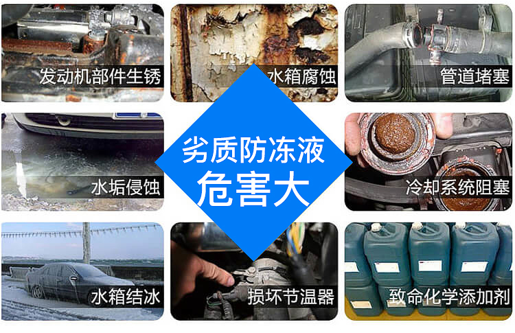 首先是防腐蝕功能。發動機及其冷卻系統是金屬制造的,有銅、有鐵、有鋁、有鋼還有焊錫。這些金屬在高溫下與水接觸,時間長了都會遭到腐蝕,會生銹。而防凍液不僅不會對發動機冷卻系統造成腐蝕,還具有防腐和除銹功能。