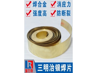 三明治銀焊片,復(fù)合銀焊片,補償銀焊片/夾心銀焊片的牌號是:BAg50M。是一種含50%銀銅鋅錳的銀基釬焊材料,固液相線:660~740℃,建議最低釬焊溫度:780℃。是一種兩片銀釬料片中間加有銅墊片或鎳墊片的特殊焊片,也就是加有補償墊片的銀焊片。主要應(yīng)用于釬焊焊縫長度超過12.7mm的合金,硬質(zhì)合金或者大面積釬焊面的工件,以防止因異種金屬間焊接其熱膨脹系數(shù)不同而產(chǎn)生的開裂現(xiàn)象。焊接時需添加助焊劑,如銀焊粉、銀焊膏等,且焊前需對工件進(jìn)行除油除銹處理,焊接時注意保持良好通風(fēng)。廣泛運用于各種硬質(zhì)合金刀具,車刀,鉆具,礦山釬具的釬焊。圈裝帶材,寬度可訂制裁切。