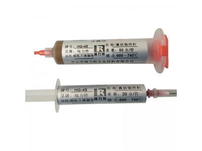 膏狀銀焊料,膏狀銀釬焊料,銀焊膏、銀釬焊膏、釬焊膏公司牌號(hào)是:HG-45。是一種由超細(xì)銀合金粉末、助焊劑、粘結(jié)劑組成的膏狀銀釬焊料。固液相線:665~745℃,建議最低釬焊溫度:760℃。是銀銅鋅系列的產(chǎn)品,適用于復(fù)雜焊點(diǎn)、精細(xì)焊點(diǎn)、密集焊點(diǎn)等各種黑色金屬及除鋁鎂外金屬工件的釬焊,采用火焰釬焊,高頻釬焊,電阻釬焊,爐中釬焊等都行,焊接時(shí)無需添加助焊劑,但焊前需對工件進(jìn)行除油除銹處理。廣泛運(yùn)用于精密儀器、大功率發(fā)電機(jī),水輪機(jī),航空發(fā)動(dòng)機(jī)等產(chǎn)品。配合自動(dòng)點(diǎn)膏機(jī)、自動(dòng)釬焊機(jī),可以實(shí)現(xiàn)高效率規(guī)模化生產(chǎn)。釬焊是個(gè)系統(tǒng)工程,因涉及到釬料的匹配性,請親們下單前先通過旺旺咨詢我們店主,以便為您遴選更適用和經(jīng)濟(jì)性的產(chǎn)品。