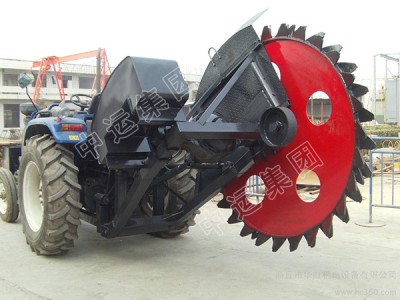 路緣石開溝機工作裝置部分,是由動力傳動部分(傳動系統總成,?離合器總成,刀盤系統)及液壓部分組式。路緣石開溝機動力由具有超低速檔的拖拉機變速箱第一軸左側輸出,經鏈條傳到工作裝置第一軸,經手動離合器傳到懸臂式減速箱第一軸,最后由懸臂式減速箱第五軸將動力輸出,帶動刀盤轉動,同時液壓系統的油缸將刀盤壓下,采用逆銑原理,實現一次成溝。路緣石開溝機液壓系統由油泵(拖拉機自帶)、油箱、高壓油管、雙作用油缸、分配閥組成。柴油機啟動后,接合柱塞泵離合器,油泵即開始工作,通過控制分配閥手柄,實現刀盤的升降。該液壓系統有“自鎖”功能,操作方便、可靠。