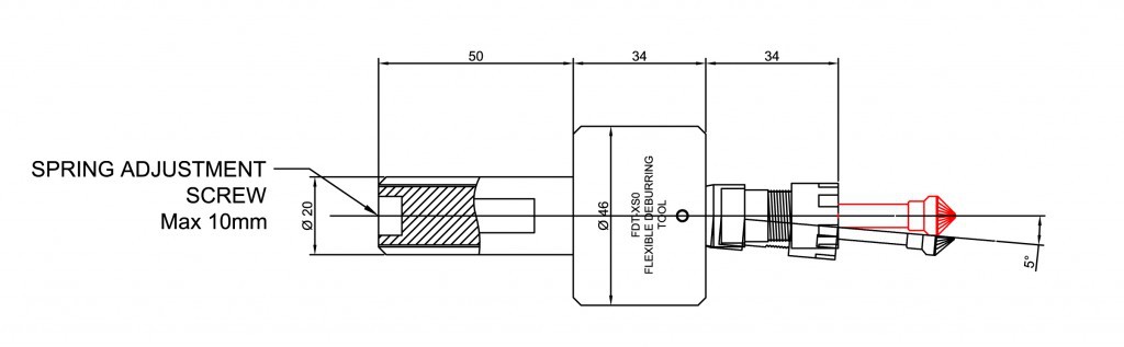 FDT SXO 浮動去毛刺倒角工具:通過主軸驅動,可以達到5mm的徑向偏移量(標準旋轉銼或者倒角銑刀露出夾頭部分為20mm)。要保證在走輪廓程序時所有的輪廓都能被加工,切削頭需要有1-3mm的預壓入量。