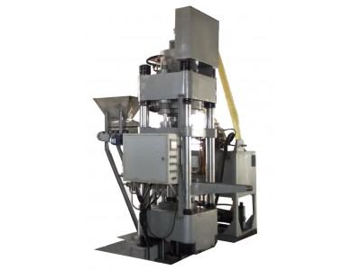 混合好物料→加入設備后上方料斗→料斗內的料定量加入加料框內→加料缸帶動加料框前進,把料加入模具內,接著加料缸退回復位→子缸帶動主缸活塞桿和沖頭快速下壓→當沖頭進入模腔后,子缸轉入主缸慢下加壓,將模具內的物料用高壓壓制成高密度舔磚塊(脫模浮動缸同時下降,實現雙向浮動壓制)→主缸微升(沖頭不出模具)→脫模浮動缸帶動??蛳侣?,把舔磚塊從模具中脫出→抽芯缸抽出芯桿→子缸及主缸上升→加料缸前進把成品推出的同時加料框移動至模具上方→脫模缸帶動??蛏仙纬煽涨煌瓿杉恿希⑦M入下一次循環程序