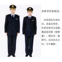 專業生產定制廠家 肩章:高分子PU材料特種工藝制成,黑色底,金色圖案由衛生監督圓形徽和五條由寬到窄的折線組成。 硬肩章:153cm×50cm,制服佩帶。 軟肩章:143cm×50cm,半袖襯衫、外穿長袖襯衫佩帶長襯。 套式肩章:133cm×50cm,大衣佩帶。 (四)臂章:盾牌外型,圖案由中國衛生監督中英文及衛生監督徽組合而成,面料及工藝同肩章。 三、服裝面料及式樣 (一)制服:藏藍色,以江蘇陽光集團3710#為標準色,秋冬季厚面料,春夏季薄面料,單排扣西式套裝,式樣見附圖(略)  新版式 定制 量體裁剪 驗貨付款  高支棉  精做工  歡迎來廠制作
