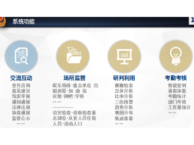 基于LBS地理位置的掌上治安管控系統(tǒng),借助科技支撐,打造一圖兩端(電子地圖、手機端(yi動jing務(wù)端)、PC電腦端)立足實現(xiàn)治安綜合要素管控動態(tài)可視、人地事物情可知、治安態(tài)勢可控、尋人布控可達,實現(xiàn)場所行業(yè)信息動態(tài)可視化、管理辦公智能化、核對檢查實時化、分級管理高效化、考核分析自動化,落實了民警對場所行業(yè)管理實時、實地、實情、實效“四實”管理。