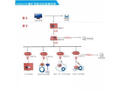 系統(tǒng)由監(jiān)測主備機(jī)、打印機(jī)、不間斷電源、電源防雷器、RS485/USB轉(zhuǎn)換器、KJ616(A)-J礦用本安型數(shù)據(jù)傳輸接口(以下簡稱接口)、KJ616(A)-F1礦用本安型傳輸主站(以下簡稱主站)、KJ616(A)-F2礦用本安型監(jiān)測分站(以下簡稱分站)、傳感器、KDW28-18(A)礦用隔爆兼本安不間斷電源及線纜等設(shè)備組成。