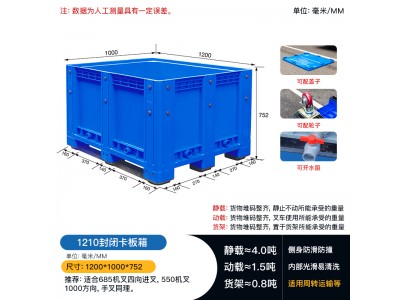 廠家直供西安1210封閉卡板箱四面進叉箱式托盤,卡板箱是在塑料托盤的基礎上,以底部托盤加上部箱體制作成的大型裝載周轉箱,適用工廠周轉,產品儲存。主要應用各種零部件和原料的包裝,儲存和運輸,汽車零部件,衣服面料,蔬菜等集裝化包裝,是一款應用廣泛的物流容器。