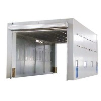 整體移動式噴漆間的設計目的,是為了滿足較大型工件 打磨或噴漆的需要。一般情況下每套房體對應2~3個排風凈化工位,哪個工位上的工件需要噴漆時,房體則行走移動到那個工位,其他工位可以繼續打磨工作,待 房體內的工件噴漆完畢后,再控制移動房體行走到打磨完畢后的工件工位,如此設計可以實現大型工件的不間斷連續噴漆工作。房體為鋼結構構造,房體立柱下面設置有兩臺電動驅動行走機構,行走機構沿地面軌道行走。移動房體兩端設置有電動卷簾大門,房體行走時,大門升起,待到達位置時,大門降落關閉。大門與行走機構由電氣控制部分連鎖控制,大門完全升起后,房體才可移動行走。