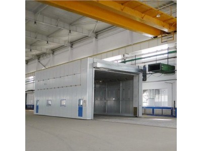 整體移動噴漆房主要用于大型工件的打磨或噴漆,便于收集工作中產生的粉塵或廢氣。一般情況下,每套房配有2-3個排氣凈化站。當哪個工位上的工件需要噴漆時,房間移動到那個工位,其他工位可以繼續拋光。當室內的工件涂漆后,控制移動室移動到拋光工件工位。這種設計可以實現大型工件的不間斷連續涂裝。房屋為鋼結構,房屋的立柱下有兩個電動行走機構,行走機構沿地面軌道行走。移動房兩端安裝電動卷簾門。當房間行走時,門上升,當房間到達位置時,門著陸并關閉。門和行走機構由電氣控制部分連鎖控制,只有門升起后,房間才能移動和行走。