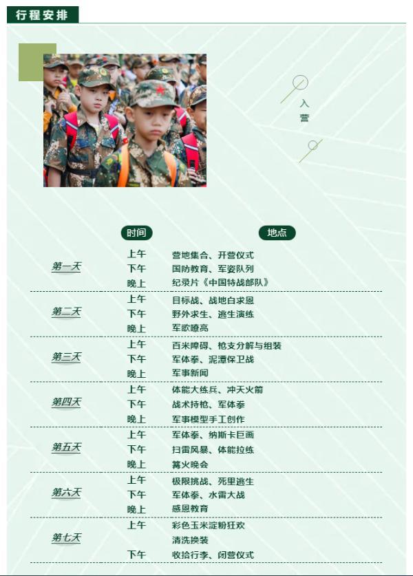 暑期夏令營以特戰部隊訓練科目和作風為主元素,突出軍旅文化;讓營員在體驗軍事生活,感受軍事活動氛圍中,培養勇敢頑強.果斷堅毅.吃苦耐勞的精神品質。