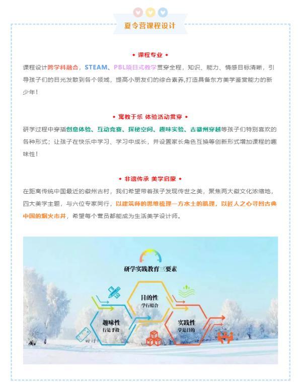 徽州深度研學營,融合四大美學主題(生活美學,建筑美學,自然美學,工藝美學),由多位大師引領:制墨、"歙"硯、烹徽菜、勘察古村營造、裝配徽派古建、調查鄉野生態、徒步徽杭古道、沿襲非遺傳承、學習徽州民謠、探訪徽商精神……在設計師、建筑師、藝術家、非遺大師帶領下,以設計思維探究如何讓古典文化之美重獲新生,如何造田、理水、營居,如何追溯、傳承、創造,讓孩子們望得見山,看得見水,記得住鄉愁;緊密圍繞國家研學三要素展開深入的徽州研學探索,教會孩子向外學會探索世界,向內學會探索自我!