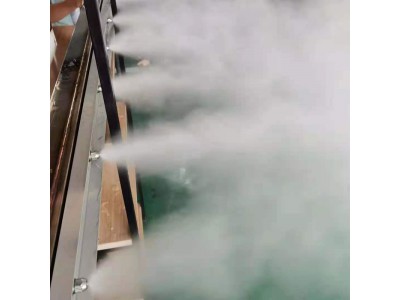 通過環境優化系統利用高壓霧化或空氣霧化,產生顆粒非常細的干霧(霧粒徑小于10 微米)來抑塵的。這種技術產生霧滴遠遠小于噴淋除塵產生的液滴,空氣中彌漫的粉塵就是在這些超細的霧滴吸附、凝聚下,規模和質量不斷增長,在重力影響下,加速沉降,實現抑塵目的。