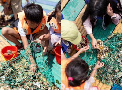 乘船登海上平臺,拔地籠,親手收獲扇貝、牡蠣等海產,午餐品嘗自己收獲的海鮮。