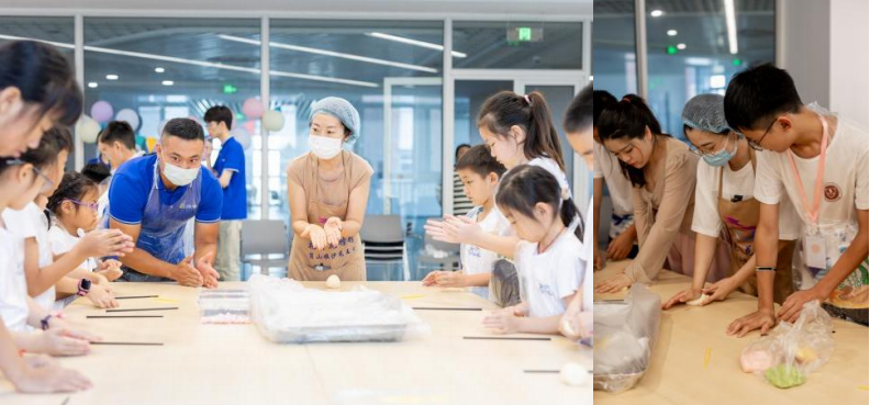 我們邀請了膠東傳統村落——沙龍王村的阿姨奶奶們教孩子們學習揉面、塑形等手藝,小小的面團,經過孩子們靈巧雙手的搓揉,搖身一變,成了充滿童趣的小豬、兔子、烏龜、熊貓.....