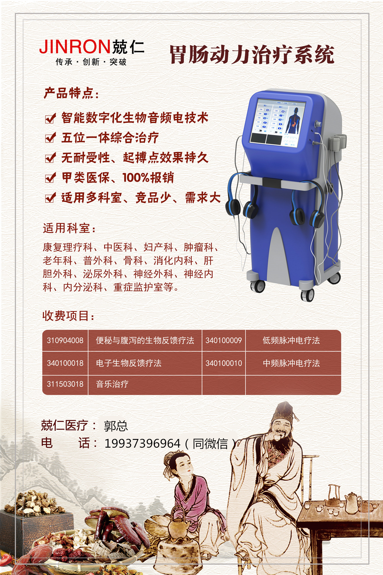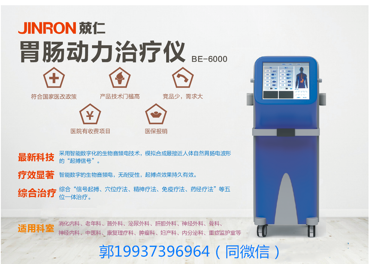 胃腸動力治療系統是采用高科技智能生物音頻技術、數字合成技術,生產成特定胃腸生物起搏電信號,對胃腸起搏點進行刺激起搏,結合專用起搏介質,糾正異常胃腸電節律,抑制異位起搏點的電活動,來治療各種功能性胃腸疾患的儀器。
