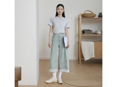 溫碧霞代言IRENENA服裝時尚百搭顯瘦蕾絲藍色闊腿牛仔褲