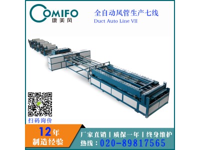 康美風全自動風管生產(chǎn)七線(歐式GDF法蘭風管生產(chǎn)線)由四個料架,調(diào)平壓筋,沖方口,沖尖角,折邊,剪切,專利型升降轆骨機 (可實現(xiàn)剪切,聯(lián)合角成型,直角骨成型三位一體),雙聯(lián)GDF法蘭成型機,送料平臺(可選),液壓折邊合口機組成。采用全電腦PLC控制,觸摸屏操作,可根據(jù)操作要求設置任意尺寸進行下料,該生產(chǎn)線最大加工速度為18米/分,精度為:長度誤差± 0.5mm,對角線誤差為± 0.5mm, 標準開料架承重5噸,可根據(jù)客戶要求配套??缮a(chǎn)出“L”、“口”型帶咬口、TDF共板法蘭、折邊的風管。全自動風管生產(chǎn)線占地面積小,直線型加工,生產(chǎn)效率高,適合規(guī)模化風管加工。