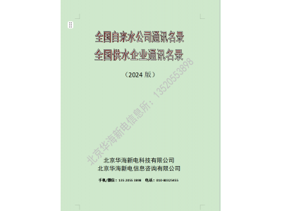 北京華海新電科技有限公司于2002年開始編纂《全國自來水廠通訊名錄》,到今年已經走過了23個年頭,《全國自來水廠名錄》頁碼由當初的200頁擴編到現在的520頁。期間得到了廣大客戶的幫助,在此一一致謝。  《全國自來水廠名錄》收錄了2024年前投產的自來水廠3000余家。信息內容包含:自來水廠名稱、法人、各科室聯系人、郵編、地址、處理工藝、投產時間、。