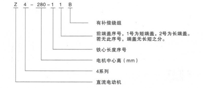 西安泰富西瑪Z4系列直流電機以Z4-280-11B為例,Z表示直流電動機,4表示4系列,280表示電機中心高(mm),第一個1表示鐵心長度序號,第二個1表示前端蓋序號,1為短端蓋,2為長端蓋,B表示有補償繞組。