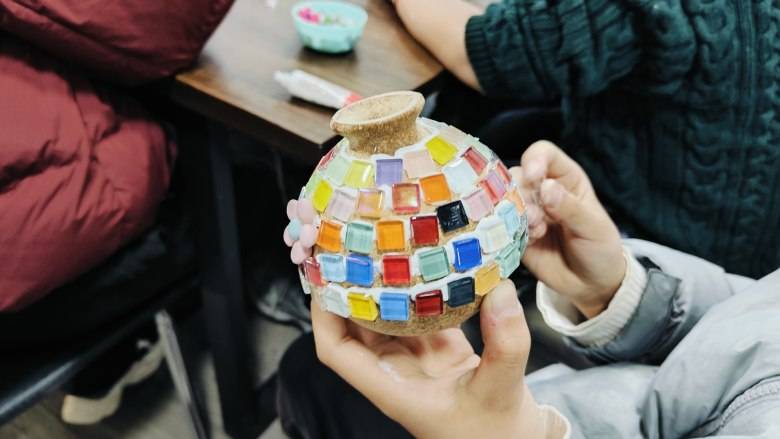 待所有馬賽克碎片粘貼完成后,用小刷子將填縫劑均勻地涂抹在碎片之間的縫隙中,確保縫隙被填滿。填充完成后,用濕布輕輕擦拭花瓶表面,去除多余的填縫劑,使馬賽克圖案更加清晰。