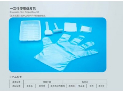 本產(chǎn)品由主要配置:膜手套、和選用配置:包布、衛(wèi)生紙、滑石粉、海綿刷、物品盒、醫(yī)用無布敷料、紗布塊組成。產(chǎn)品應無菌,經(jīng)環(huán)氧乙烷滅菌后環(huán)氧乙殘量應不大于10ug/g.一次性使用
